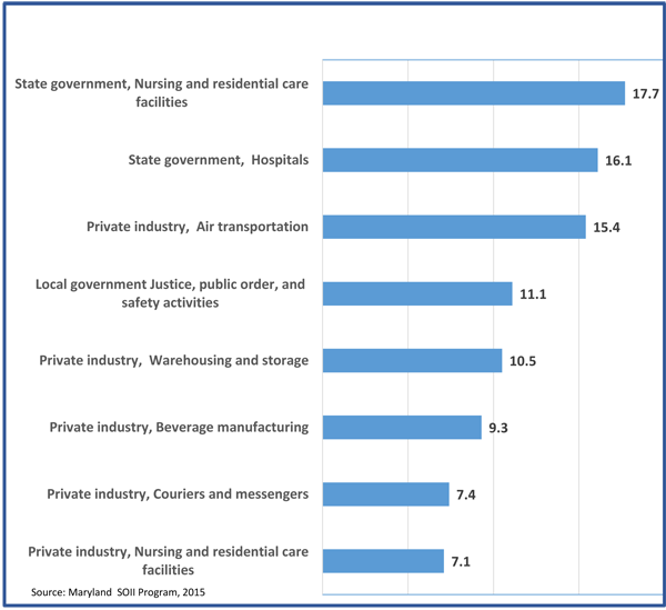 - State government’s nursing and residential care facilities reported the highest total recordable case incidence rate (TRC) rate of any industry in the State with 17.7 cases per 100 full-time equivalent workers. This industry has reported the highest TRC rate in Maryland every year since 2009.