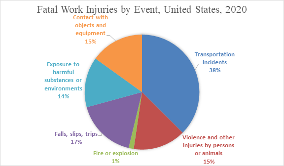 Nationally, transportation incidents fell 16 percent to 1,778 in 2020 from 2,122 in 2019 but remained the most frequent fatal workplace event in 2020, accounting for 37 percent of all fatal work injuries. Falls, slips, and trips was the second-most common fatal event (17 percent), followed by contact with objects and equipment (15 percent), and violence and other injuries by persons or animals (15 percent).